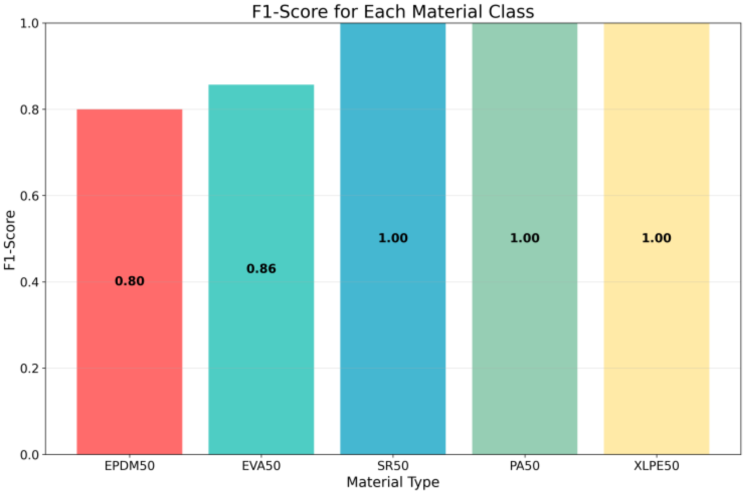 Figure 11. As the harmonic mean of precision and recall, the F1-score provides a balanced metric that simultaneously accounts for both false positives and false negatives, making it particularly suitable for evaluating classification performance in multi-class scenarios. Each bar in the chart represents a different material category, with the bar height corresponding to the F1-score value, ranging from 0 to 1. This visualization reveals the varying performance of the model across different material types, highlighting differences in classification accuracy that may arise from variations in gas emission characteristics, sensor sensitivity, or data quality. Materials with higher F1-scores indicate stronger discriminative features and more reliable classification, whereas lower scores point to areas where the model requires improvement. Such analysis is essential for understanding the strengths and limitations of the model, guiding future research directions, and informing decisions regarding sensor array optimization and feature selection strategies.