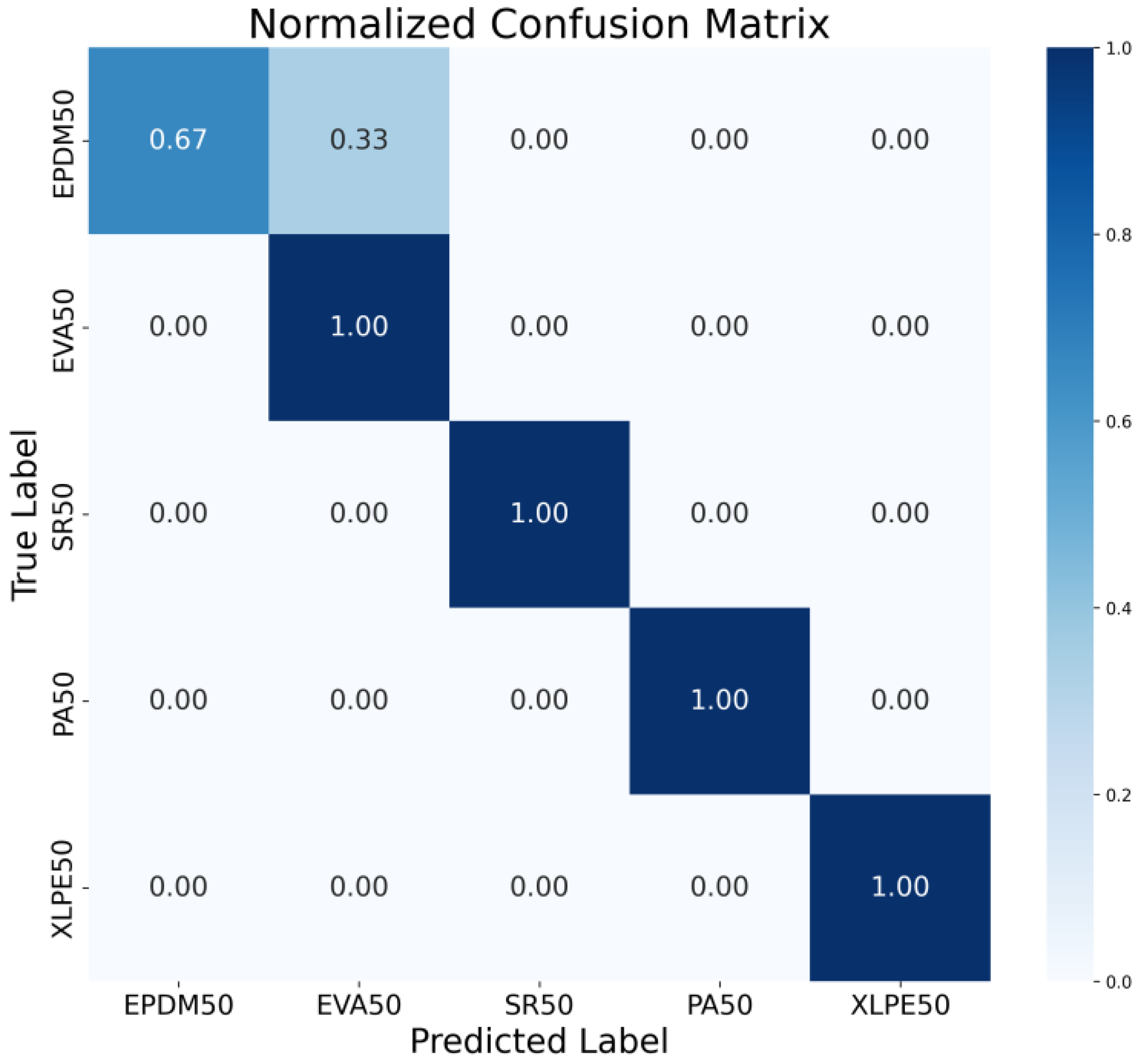 Figure 12, each cell in the matrix represents the proportion of samples from a true class that were predicted as the corresponding class, with values ranging from 0 to 1. The normalization process is achieved by dividing each row’s values by the total number of samples in that true class, ensuring that the sum of elements in each row equals 1. This eliminates evaluation bias caused by unequal sample sizes across different material categories, making it particularly valuable for analyzing datasets with imbalanced distributions. Through the normalized confusion matrix, the model’s relative performance across different material categories can be intuitively analyzed. The matrix clearly highlights materials that are easily recognized with high accuracy as well as categories that suffer from higher misclassification rates. Darker-colored cells correspond to higher classification accuracy, reflecting stronger recognition capability for those material classes, while lighter-colored cells indicate weaknesses in classification, such as the confusion observed between EPDM and EVA materials. This visualization not only provides a quantitative basis for evaluating the generalization ability of the model but also points out directions for subsequent optimization, serving as critical guidance for improving classification performance on specific material categories where misclassification is most prevalent.