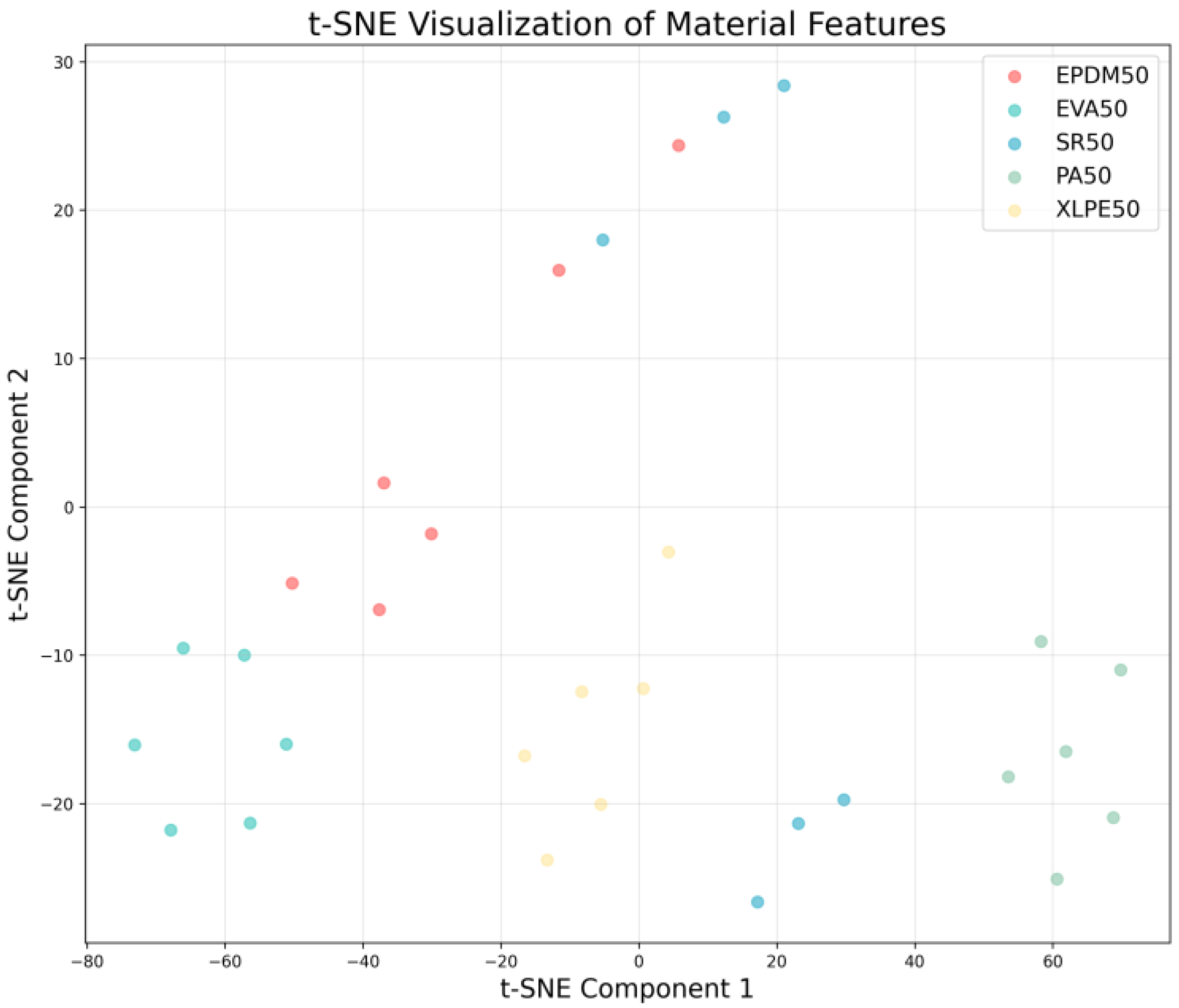 Figure 13, in the resulting scatter plot, each point represents an individual sample, with colors distinguishing the five material categories: EPDM50, EVA50, SR50, PA50, and XLPE50.