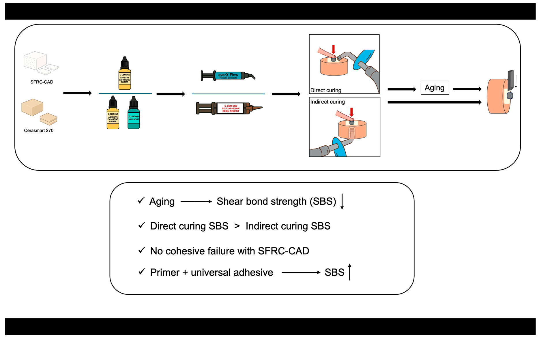 • Indirect curing resulted in lower SBS values than direct curing, likely due to light attenuation through the restorative material.