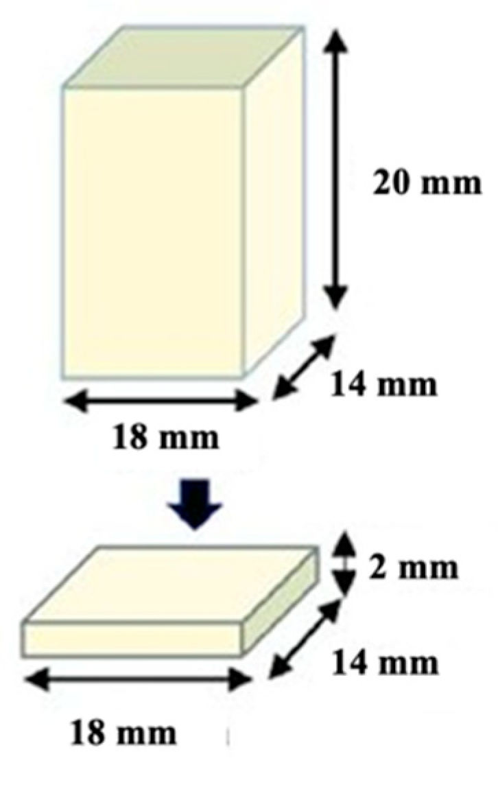CAD/CAM blocks were sectioned under water cooling using a diamond saw (Secotom-50, Struers, Ballerup, Denmark) to obtain specimens slightly larger than the target dimensions. The specimens were then sequentially ground using silicon carbide papers under water cooling to achieve the final dimensions (2 mm × 14 mm × 18 mm), which were verified using a digital caliper (Figure 1).
