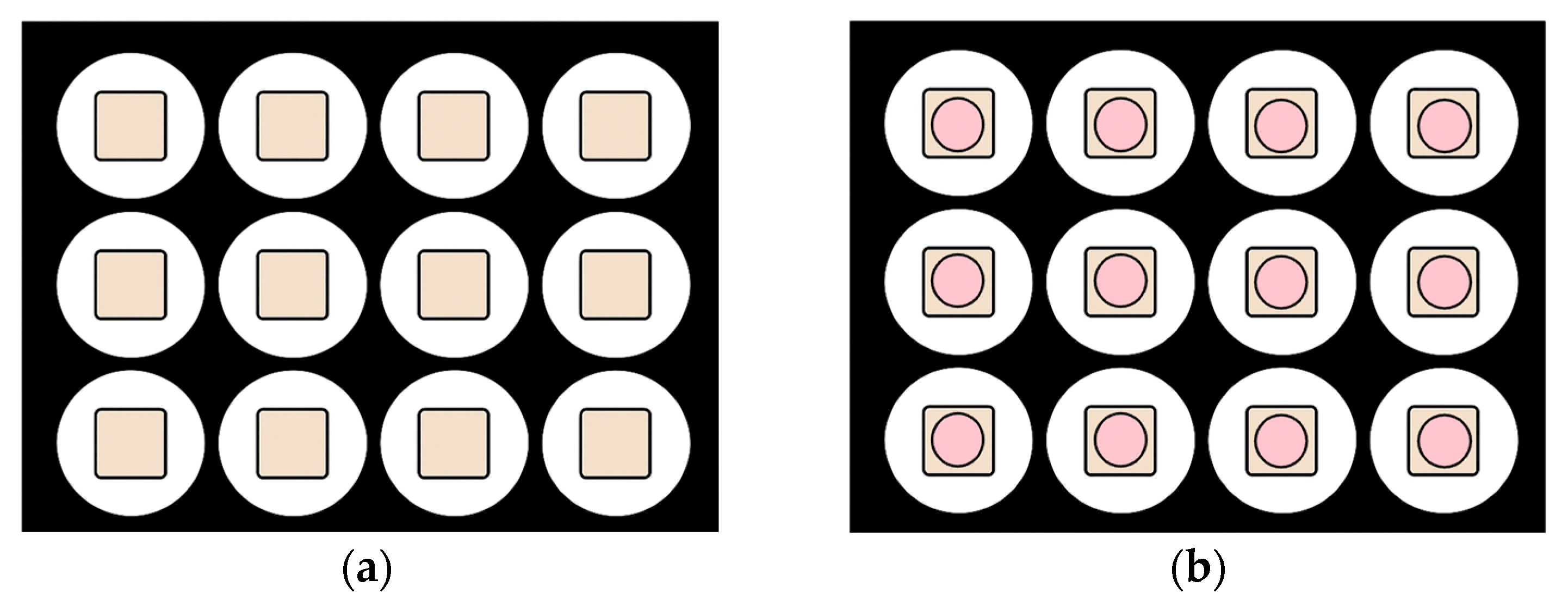 Figure 2. Preparation of acrylic jigs using mold: (a) direct curing group; (b) indirect curing group with silicone spacer. Beige areas represent the CAD/CAM block material, while pink areas indicate the silicone spacer.