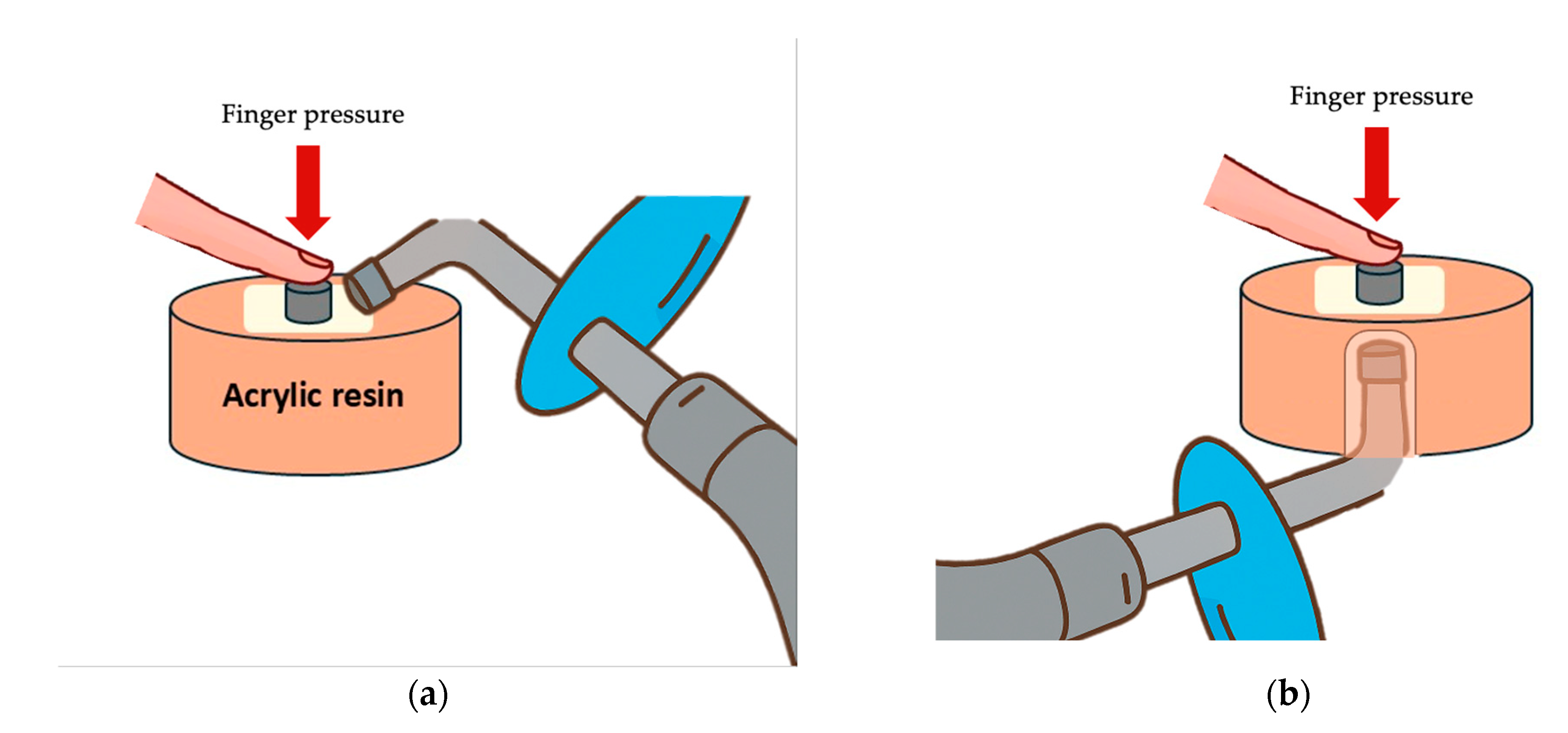 Figure 4. Light curing protocols: (a) Direct curing technique, applying light directly to the cement; (b) Indirect curing technique, applying light through the CAD/CAM restorative block. Separate specimens were prepared for each curing protocol; no specimen was subjected to both direct and indirect light-curing procedures.