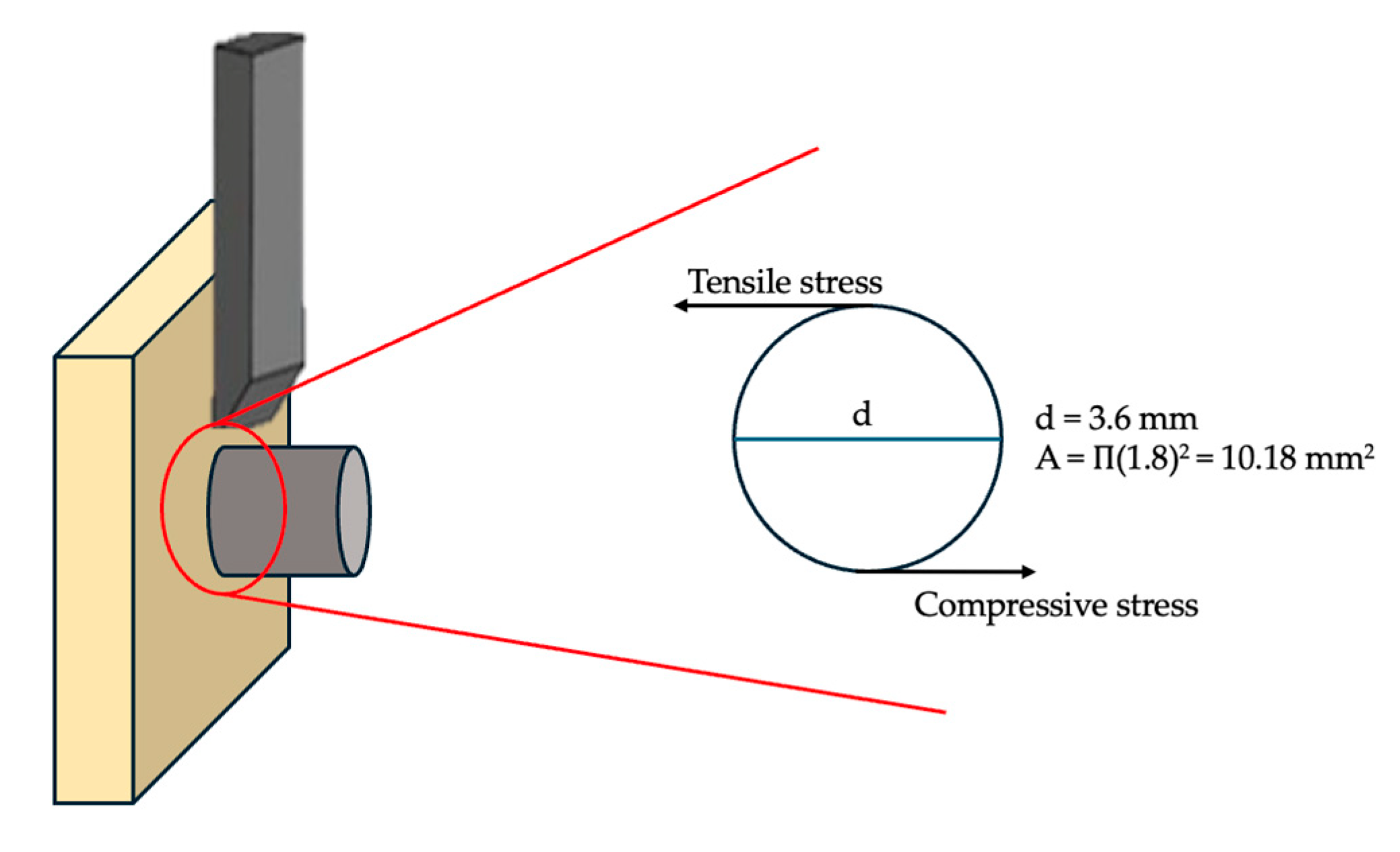 Figure 5. Schematic representation of the shear bond strength (SBS) test setup. Shear stress at the bonded interface is produced by the combined action of compressive and tensile stresses generated during loading. The bonded area is defined by the cross-sectional area of the metal cylinder (Ø3.6 mm).