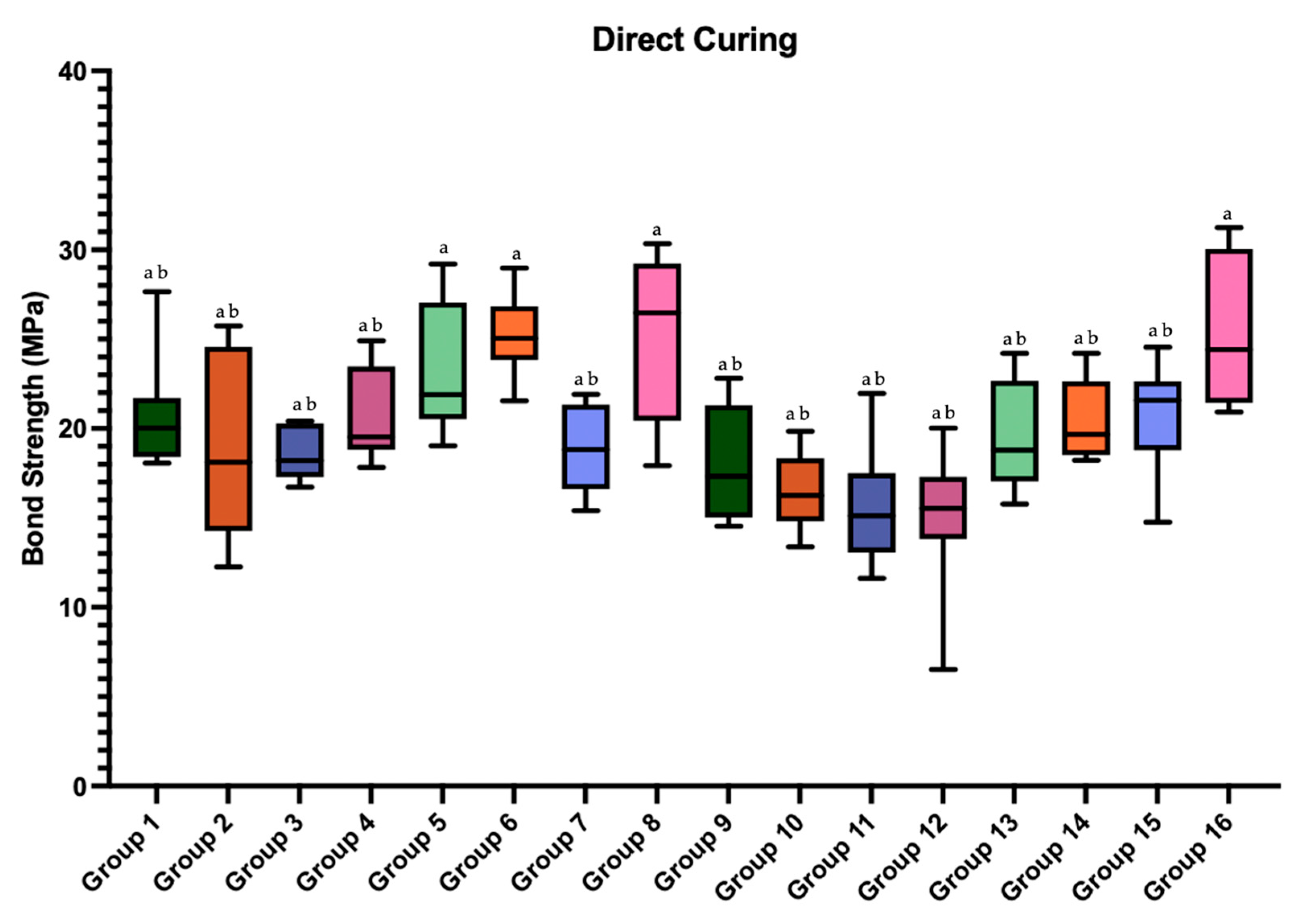 Figure 6. Box plots of the shear bond strength values of the groups prepared with direct curing. Different superscript letters indicate statistically significant differences among groups (p < 0.05). Groups sharing at least one letter are not statistically different. Group-wise comparisons were performed using the Kruskal–Wallis test followed by Dunn–Bonferroni post hoc analysis.