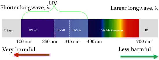 What we call ultraviolet light (UV) is the wavelength portion of the electromagnetic spectrum between 100 and 400 nm approx., as depicted in Figure 1. The UV range is divided into three parts: UV–A (315–400 nm) is the least harmful for humans, while UV–B (290–315 nm) causes sunburn, increases the risk of skin cancer, and consequent cellular damage. About 95% of all UV–B light is absorbed by the ozone in Earth’s atmosphere, and UV–C (100–290 nm) is harmful but is almost completely absorbed by Earth’s atmosphere.