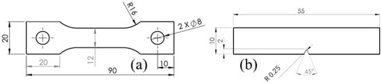 Testing samples geometries: (a) tensile, (b) impact. Dimensions in mm.