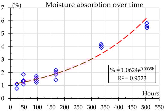 where % is the mass gain percentage, and h is the exposure time in hours. This model provides a high degree of predictability, as evidenced by an R2 = 0.9523, indicating that over 95% of the variability in moisture absorption can be represented by this equation. The adjusted R2 is very close, 0.9477, showing that there are no redundant data. The adjusted R2 penalizes the addition of irrelevant independent variables, providing a more accurate measure of the model’s explanatory power than R2 [39].