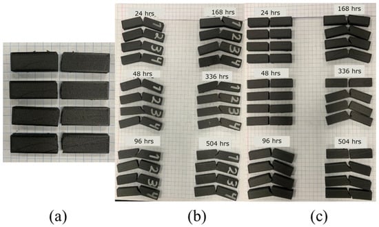 Moreover, such degradation is widely documented in the literature [3,4,5,9,10,11], and consists of a change in mechanical properties such as hardness, a change in stiffness, and a decrease in ductility over time. The literature recognizes the problem of moisture absorption in nylon samples [7,12] whether submerged [8,13] or in a humid atmosphere [14]. Such mechanical tests have been reported for nylon reinforced with continuous fibers [8,15,16,17], 3D printed composites [3,4] and nylon matrix under other media [9]. Therefore, the degradation of AM printed polymers under different combinations of time, UV light, and humidity generates uncertainty over the service lifetime in the structural performance of components manufactured by this technique. However, damage in composites often starts at the matrix [18,19], but there are no studies for aging of just the MEX-printed PA6 matrix [13] due to the orthotropy imposed by the printing process [17,20]. It is important to know the effect of such exposure to understand such products’ long–term response [3].
