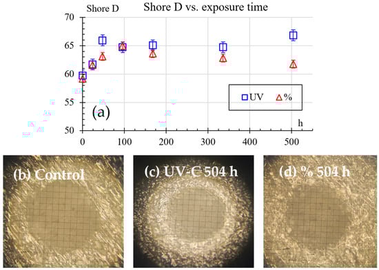 Shore D hardness results: (a) hardness vs. exposure time, (b) exemplary result of imprint with no exposure, (c) exemplary result of imprint after 504 h of UV exposure, (d) exemplary result of imprint after 504 h of 50% humidity exposure.