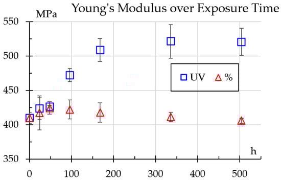 Figure 8 illustrates progression of Young’s modulus values for samples exposed to UV light and humidity. One can see distinct trends for each treatment. For UV-exposed samples, the modulus steadily increases during the first week and remains stable. Its evolution was adjusted to the time-dependent relation shown in Equation (3).