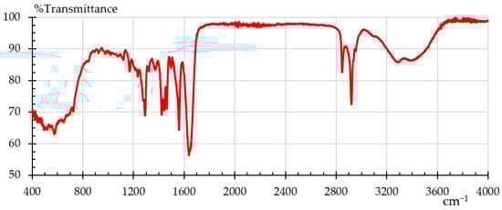 Fourier transform infrared spectroscopy (FTIR) was employed to analyze the material samples by identifying functional groups and chemical bonds present in the material. FTIR is a helpful technique for figuring out how a polymer’s degree of crystallinity has changed after a particular treatment [22]. The analysis was conducted using a Shimadzu IRAffinity–1S spectrometer(Kyoto, Japan) in ATR mode (Attenuated Total Reflectance) equipped with a diamond crystal. Data acquisition was done with LabSolutions IR software V 2.1 from Shimadzu. The instrument performed 40 scans for each sample, to average results and ensure accuracy. The characteristic spectrum for nylon, in absorption mode, is shown in Figure 3 [37] where one can see its characteristic bands: O–H 3300, N–H 3170–3370; 1515–1570; 680–750, C=O 1630–1680 cm−1. This is the baseline that later was used to evaluate Onyx as-is and Onyx after the humidity and UV treatments. It is important to clarify here that we did not find the FTIR pattern for Onyx, but there are several FTIR patterns for nylon [38].