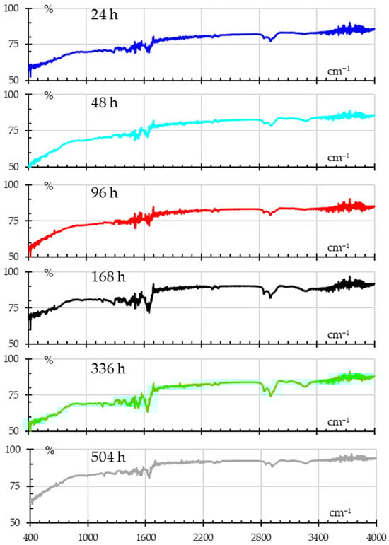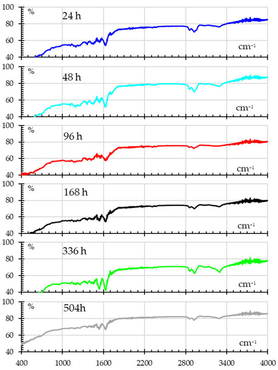 The FTIR spectra for UV-exposed samples are shown in Figure 12, showing signs of photodegradation. Shifts in the N–H bending and C–N stretching regions (around 1500–1600 cm−1) after the first 24 h indicate possible alterations to amide bonds that show progressive change. The O–H and C=O regions continue to show increased absorbance at 336 h, suggesting that prolonged UV exposure causes oxidation and the formation of new hydroxyl and carbonyl groups.