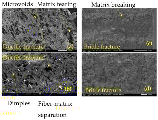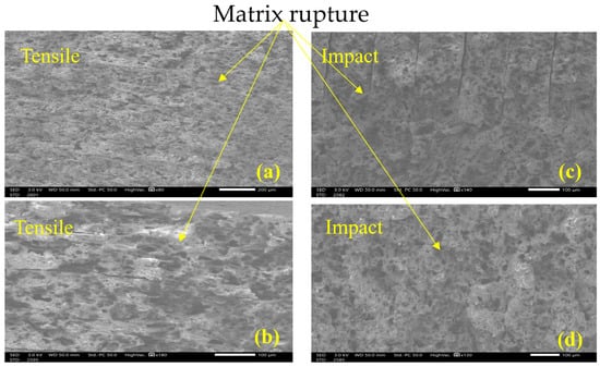 The SEM analysis of tensile and impact tests provides clear evidence of the degradation mechanisms induced by UV exposure by showing the fracture surface. At 0 h, the tensile tests reveal a fractured surface typical of ductile failure mode as seen in Figure 13a, characterized by visible deformation and high energy absorption by means of matrix–fiber debonding and matrix rupture [43] as seen in the rough, fibrous texture depicted in Figure 13b. Such behavior has been reported for the same matrix [17], from a different provider and for different printing layer height [44]. The matrix exhibits a cohesive interaction with the filaments, allowing significant plastic deformation before rupture, characteristic of a ductile material able to withstand high energy absorption [43]. These are signs of plastic deformation and possible indications of chains stretching in the polymer [43]. The impact testing induces a high strain rate; therefore, the failure mode is dominated by rapid crack propagation and a lack of significant deformation in the filaments, as shown in Figure 13c,d, where the characteristics of brittle fracture can be seen. The load is applied very rapidly, so the material does not have time to accommodate and absorb energy, producing an unstable rupture [45].