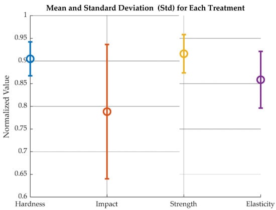 A one-way ANOVA was run with normalized values to assess the difference between treatments with an uncertainty of 5%. Normalized values refer to Strength, Elasticity, Hardness, and Impact values divided over their respective maxima. The null hypothesis was that “the averages of the different measurements are equal among them”. Figure 15 shows the comparison of normalized values for mean and standard deviation and Table 2 the relationship among variables.