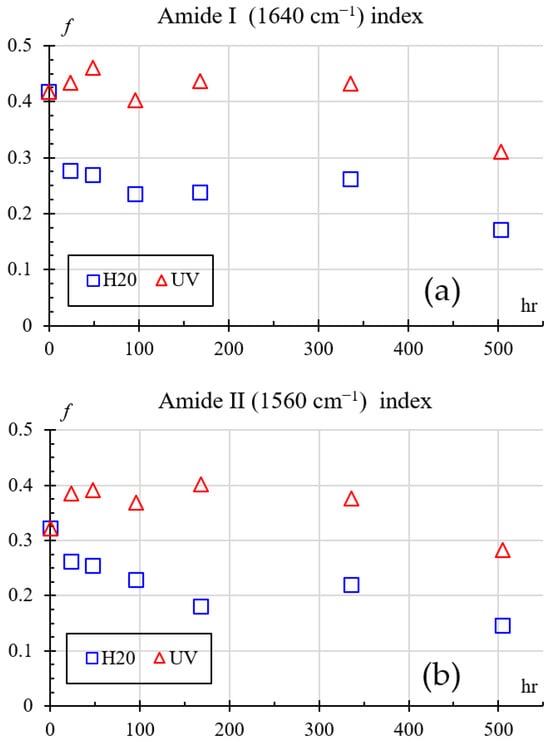 where I is the intensity at a given wavelength, Iref is the intensity at 2400 cm−1, and f is the fraction change. The 2400 cm−1 wavelength was chosen because it is transparent to IR and was unaffected in all treatments. Figure 16 shows how the amines change over time for both exposures, Figure 16a for 1640 cm−1, and Figure 16a for 1560 cm−1. Comparing the indexes with respect to the baseline (0 h at 41.78%), one can see that both amide indices show variations from 3 to 6% for UV and 23% for humidity exposure during the first 24–96 h. This behavior is consistent with an early stage of chemical change in which only limited modification of the amide environment occurs.