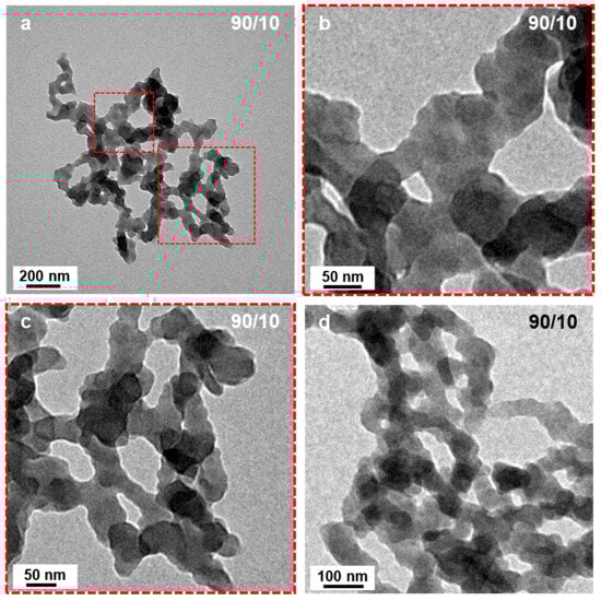 Decreasing the amount of DIPE from 90 to 70 v% (the polarity index, P’ increasing from 2.59 to 2.97) did not appear to strongly affect the morphology of the samples after 15 h of irradiation (Figure 3a,b), since similar networks with short interconnected ill-defined worm-like segments could be observed. The micelle morphology was more strongly affected by the polarity of the system when P’ increased to 3.16 (DIPE/EtOH 60/40 v/v%), since we could clearly distinguish the presence of small spheres with diameters close to 20 nm aggregated together. Once again, these structures were extremely similar to those reported by György et al. [40] for PLMA30-PMMAx formulations when the DP of the PMMA block reached high values (x = 196, for example).