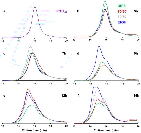 GPC traces of (a) PtBA42, and DIPE (P’ = 2.40) (green), DIPE/EtOH (70/30 v/v%) (P’ = 2.97) (red), DIPE/EtOH (30/70 v/v%) (P’ = 3.73) (grey) and EtOH (P’ = 4.30) (blue) after (b) 3 h, (c) 7 h, (d) 9 h, (e) 12 h and (f) 15 h of reaction time. Note that the RI values were normalized using an elution time of 18 min as a reference.
