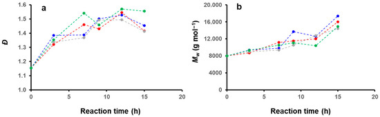 We then further investigated the effect of the solvent medium on the PISA by performing kinetics experiments by GPC (Figure 11). For this purpose, we selected four different mixtures (DIPE/EtOH: 100/0, 70/30, 30/70, 0/100 v/v%), and performed five reactions in parallel that we stopped at different reaction times: 3, 7, 9, 12 and 15 h. The main characteristics of the polymer obtained (Mw, Ɖ) are shown in Figure 12. Interestingly, despite the morphological differences observed for these samples after 15 h of reaction (cf. Figure 1, Figure 3, Figure 5 and Figure 6), the GPC traces remained relatively similar, and the weight average molecular weights obtained even after 15 h of reaction time were relatively low (ca. 16 kDa on average), indicating that the reactions were particularly slow throughout the PISA experiments.