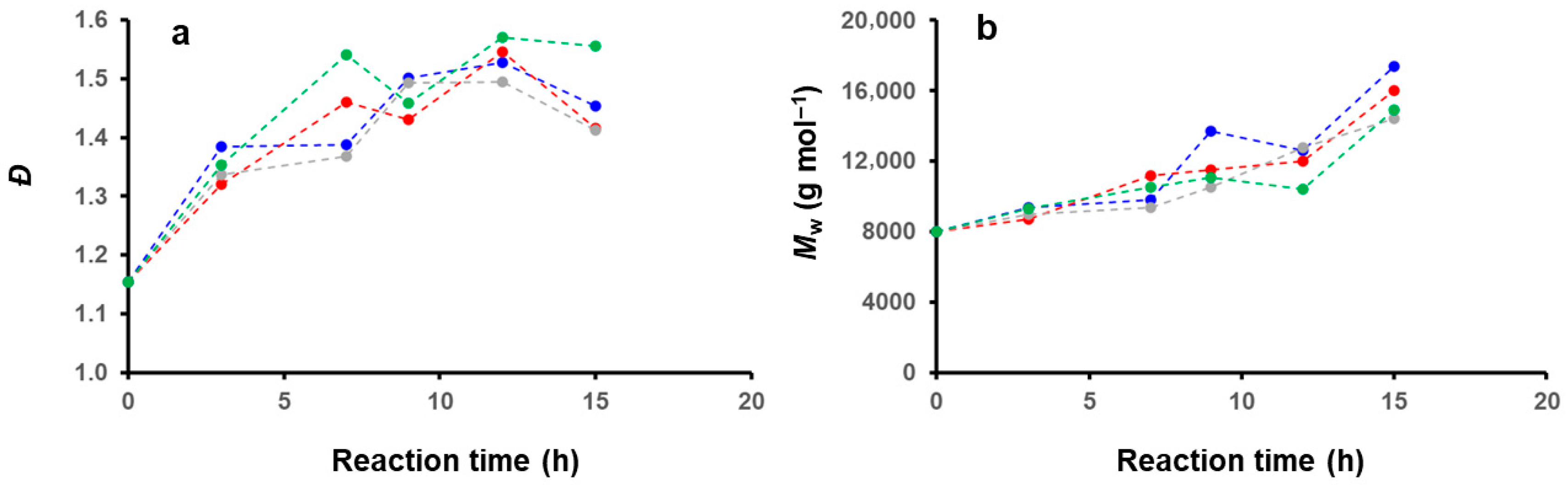- Zhang, X.; Yu, Z.; Ma, J.; Liu, Y.; Zou, H.; Xu, C.; Xian, M. Green Preparation of Ultra-High Molecular Weight Narrow-Distribution Polystyrene by Enzymatic Synthesis. Eur. Polym. J. 2026, 242, 114441. [Google Scholar] [CrossRef]