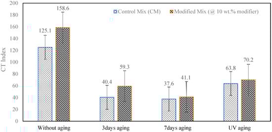 The IDEAL-CT results revealed improved cracking resistance for the modified mixture under unaged conditions and after 3 days of thermal aging, with diminishing differences noted after extended thermal aging. After 7 days of thermal aging, the modified mixture exhibited slightly higher values than the control, though the differences were not statistically significant. Under conditions of combined thermal and ultraviolet aging, modest enhancements in were noted, indicating slight resistance to photo-oxidative degradation mechanisms.
