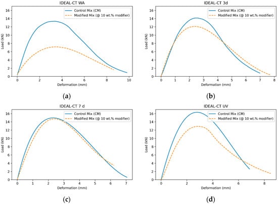 (a) IDEAL-CT load–deformation curve for unaged specimens (WA); (b) IDEAL-CT load–deformation curve after 3 days of thermal aging; (c) IDEAL-CT load–deformation curve after 7 days of thermal aging; (d) IDEAL-CT load–deformation curve after combined UV and thermal aging.