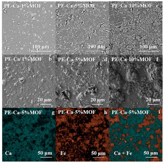 SEM images of (a,b) PE–Ca–1%MOF, (c,d) PE–Ca–5%MOF, (e,f) PE–Ca–10%MOF, and (g–i) EDAX mapping of PE–Ca–5%MOF.