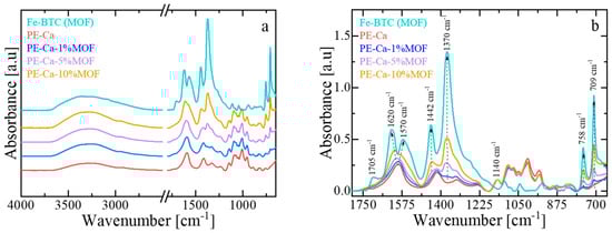(a) FT–IR spectra of PE–Ca and PE–Ca–MOF composites containing water-dispersed Fe–BTC. (b) Detailed view of the PE and MOF carboxylate and MOF aromatic bands associated with the BTC linker. All spectra were normalized to the area of the glycosidic ring vibration (~1140 cm−1, –C–O–C) of the polygalacturonic acid backbone. Dashed arrows serve as visual guides to highlight the main spectral changes resulting from the incorporation of Fe–BTC into the pectin matrix.