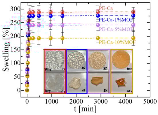 Figure 4 shows the effect of MOF amount on the swelling behavior of the composites; a higher swelling capacity facilitates the adsorbate diffusion into the matrix, increasing access to active sites and improving adsorption performance. While all composites reached swelling equilibrium within 90 min, increasing the amount of MOF led to reduced swelling, which also introduced brittleness. At 10 wt% of MOF, visible cracks appeared upon drying (see inset in Figure 4).