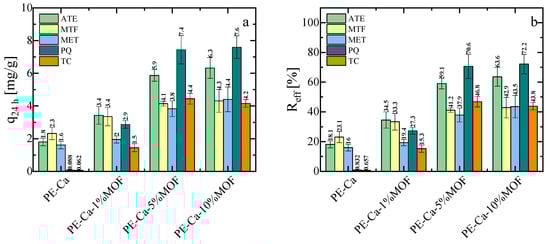 (a) Adsorption capacity and (b) removal efficiency of PE–Ca and PE–Ca composites with water-dispersed Fe–BTC after 24 h at an initial concentration of 10 mg/L, at a composite dose of 1 g/L and at pH 7.