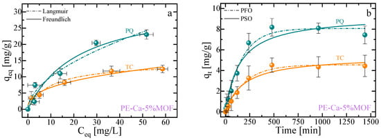Figure 7a,b show the adsorption isotherms and kinetics profiles for both contaminants. Although a total composite dose of 1 g/L was used, the calculated adsorption capacities were normalized by the mass of the active sites in the PE–Ca–5%MOF composite. This was possible because the PE–Ca matrix is not able to adsorb the PQ and TC (Figure 6). The UV–Vis spectra of PQ and TC stock solutions, respectively, used for adsorption isotherms analysis (initial concentration of 5, 10, 25, 50 and 75 mg/L) are reported in the Section S5 in SM. The isotherms data (Figure 7a) were best described by the Langmuir model [44,53], which assumes that adsorption at identical sites with a monolayer coverage (only one molecule can be adsorbed at each active site); the fitting results for both models are reported in Table 4.