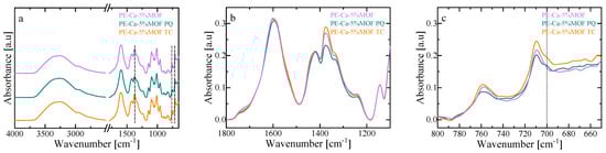 FT–IR spectra of Fe–BTC before and after adsorption of paraquat (PQ) and tetracycline (TC): (a) full spectral range, (b) carboxylate, and (c) aromatic regions (~750–1650 cm−1). The black dashed line indicates the wavenumber 700 cm−1.