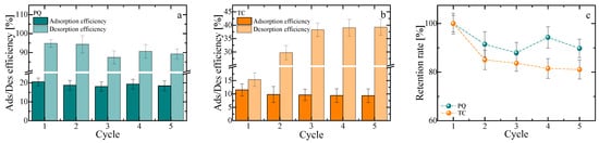 Figure 9a,b show the results over five adsorption–desorption cycles for PE–Ca5%MOF with both pollutants, PQ and TC. The results indicate that the adsorbent can be reused after desorption with no significant decrease in performance, demonstrating its suitability for industrial uses. An acidic solvent was chosen as a desorption medium because this method is inexpensive, quick, and environmentally friendly.