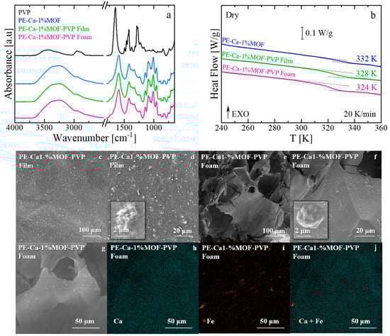 (a) Infrared spectra and (b) Heat flow versus temperature after thermal aging of PE–Ca–1%MOF (water-dispersed), PE–Ca–1%MOF–PVP film, and PE–Ca–1%MOF–PVP foam. The Tg is marked in the figure. The arrow EXO means that any exothermic event (releasing heat) is shown as an upward peak or curve. (c–f) SEM images of PVP–assisted 1 wt% MOF dispersion in film (c,d) and foam (e,f). (g–j) EDAX elemental mapping of calcium and iron for the corresponding foam samples.