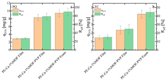 Adsorption capacity and removal efficiency of (a) paraquat (PQ) and (b) tetracycline (TC) for PE–Ca composites prepared with 1 wt% of MOF loading and dispersion methods (water or PVP-assisted, in film and foam geometries). Tests were conducted at an initial concentration of 10 mg/L, composite dose of 1 g/L, and contact time of 24 h at pH 7.