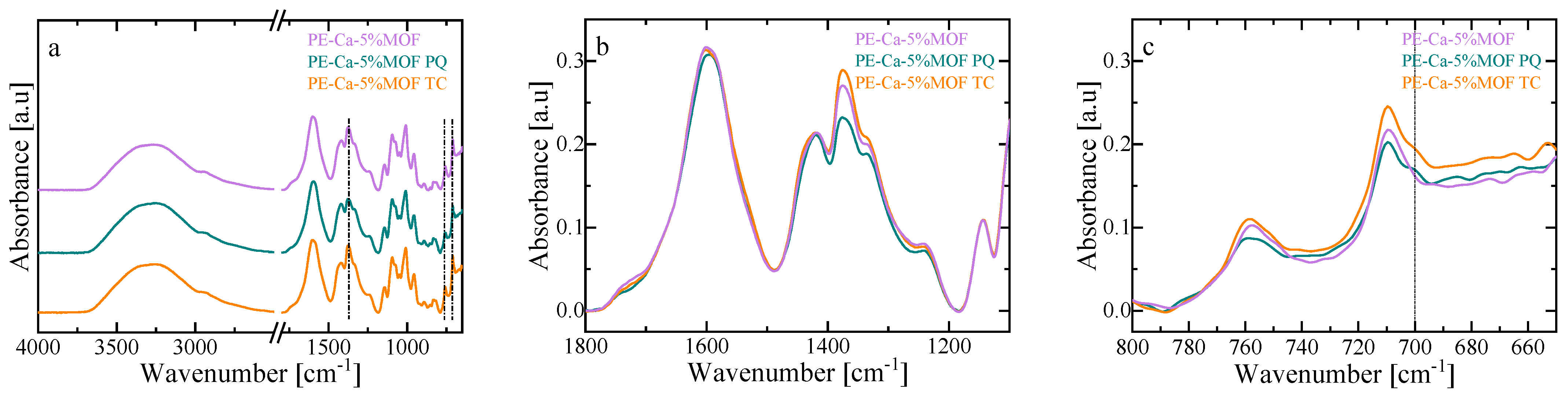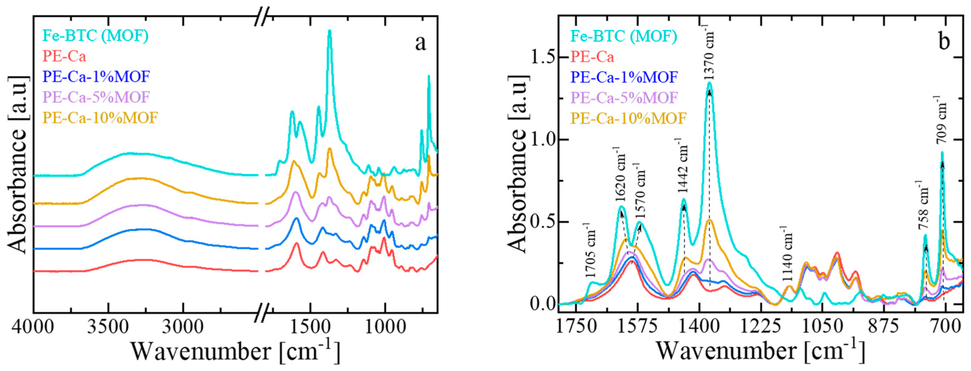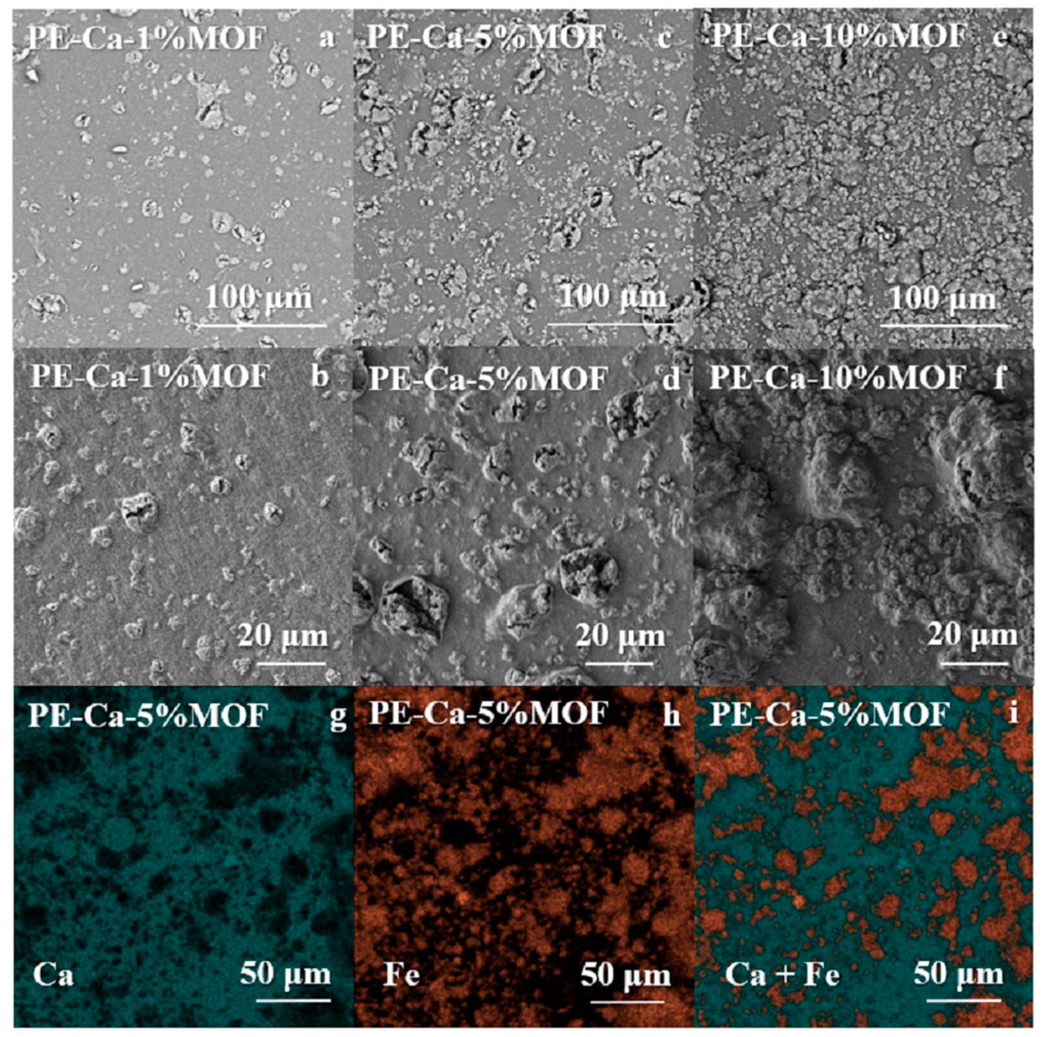 3.2. Structural Characterization of PE–Ca–MOF Films Using the Water-Dispersed Method