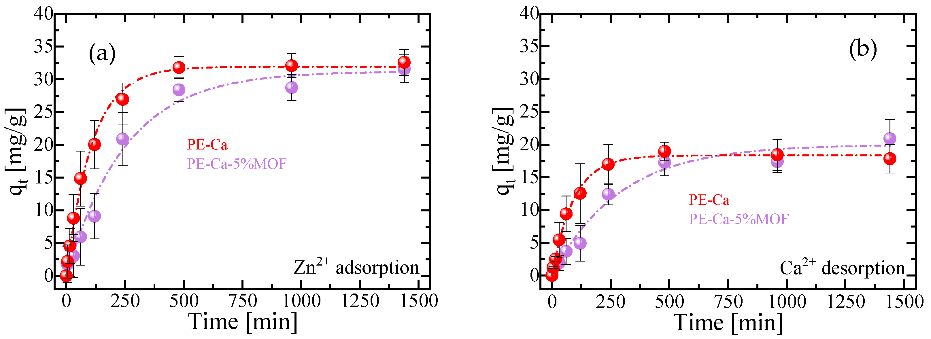 | Material | R2 | k1 Zn2+ [min–1] | qe Zn2+ [mg/g] | Zn2+ [mmol] | REff [%] | k1 Ca2+ [min–1] | qe Ca2+ [mg/g] | Ca2+ [mmol] | Exchange Ratio |