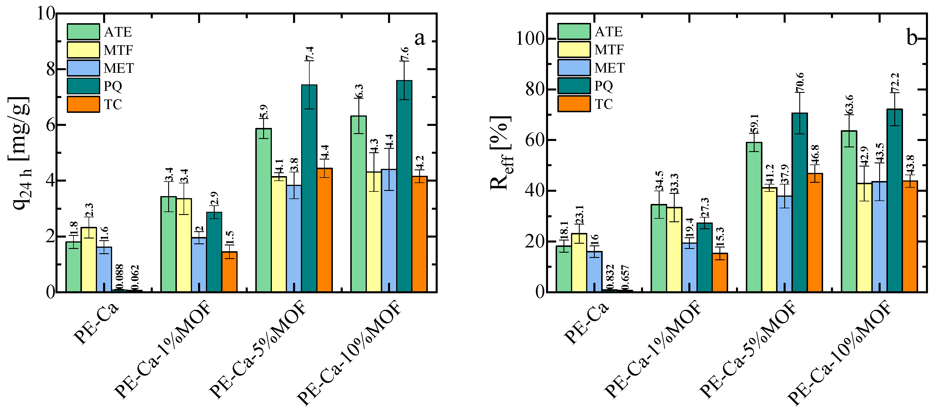 3.4. Effect of MOFs Content on the Adsorption of Pharmaceuticals and Pesticides