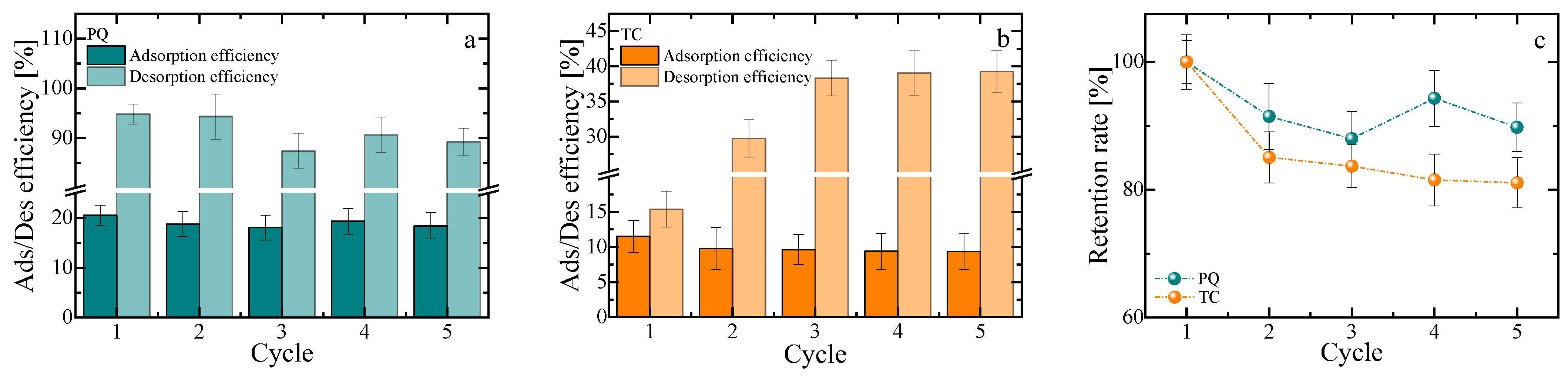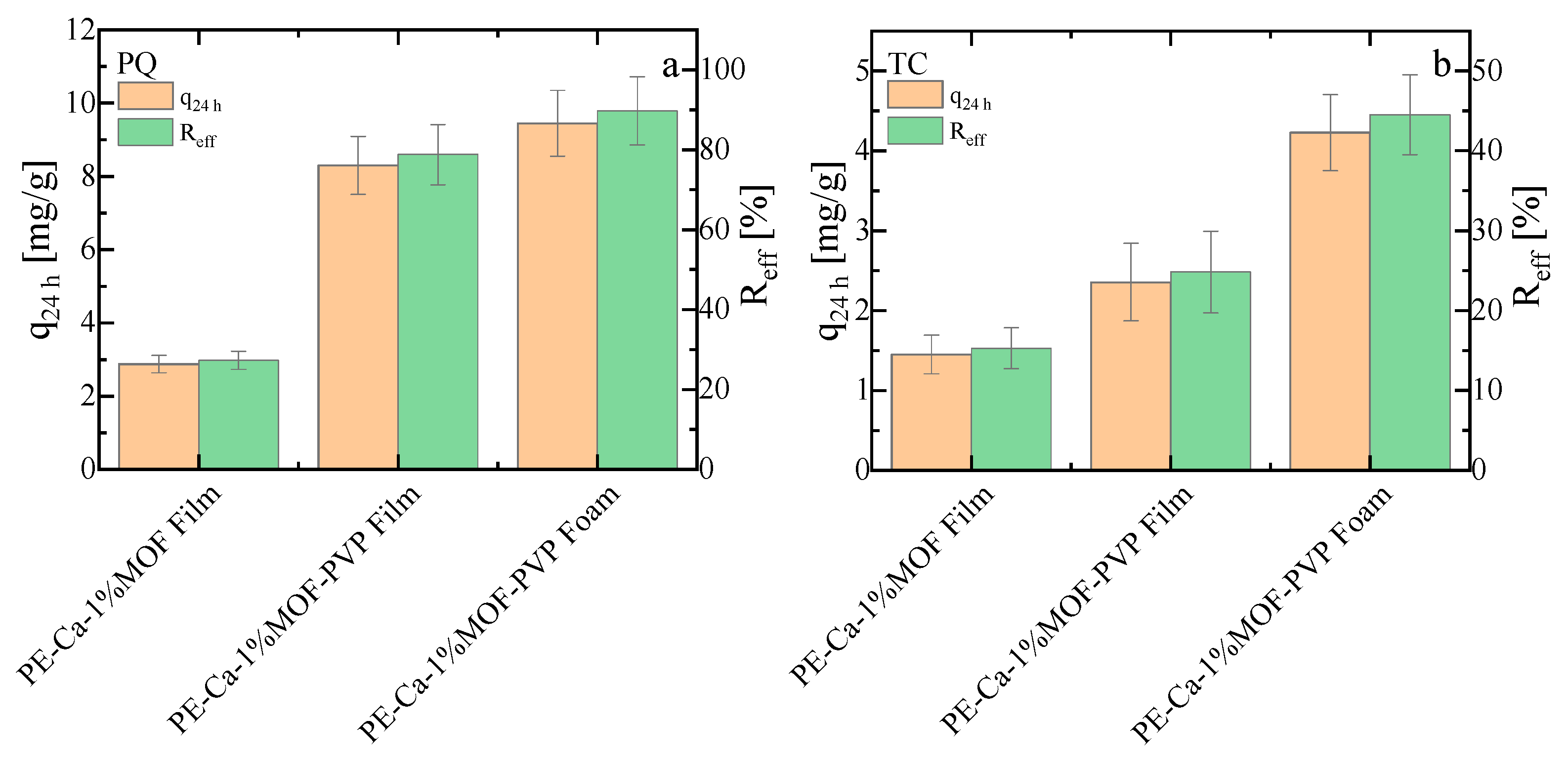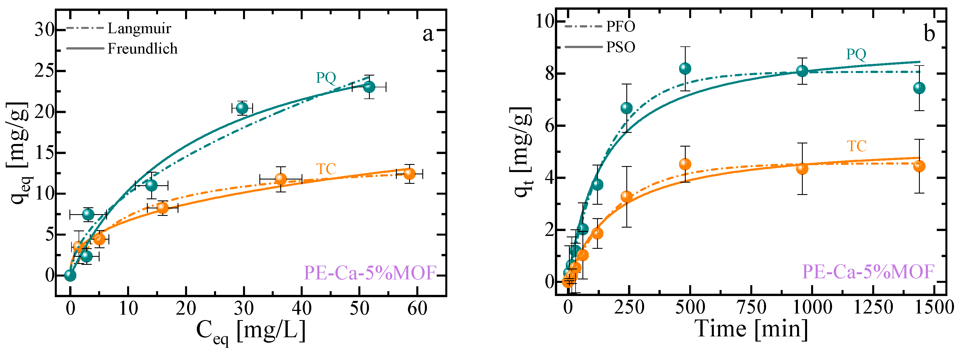 3.5. Kinetics and Isotherms of Adsorption of Paraquat and Tetracycline on PE–Ca–5%MOF