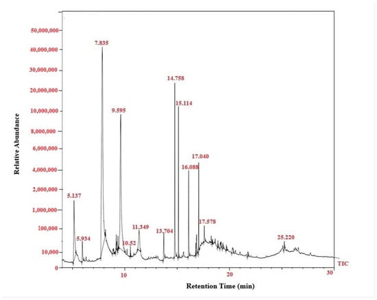 GC–MS total ion chromatogram (TIC) of γ-PGA produced by Bacillus subtilis. The chromatogram shows the retention profile of the derivatized γ-PGA fractions, with major peaks corresponding to the characteristic fragments of glutamic acid monomers and associated compounds detected within 10–30 min.