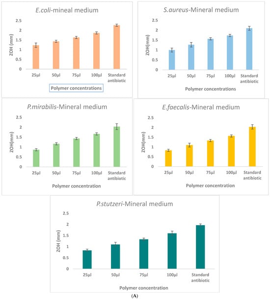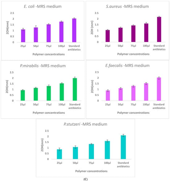 Comparison of γ-PGA production in three different culture media: (A)—Mineral medium (E-medium); (B)—Tryptic medium, and (C)—MRS medium. The selectively extracted (γ-PGA) polymer from the mineral medium (E-medium) exhibited enhanced antibacterial activity compared to polymers obtained from the other two media, suggesting that medium composition influences the biochemical properties and antibacterial mechanism of γ-PGA. Zone of inhibition (ZOH, mm) produced by γ-PGA concentrations of the extract (25, 50, 75, and 100 μL) compared with the ampicillin standard antibiotic control against E. coli, S. aureus, P. mirabilis, E. faecalis, and P. stutzeri. Each value represents mean inhibition zones from triplicate experiments.