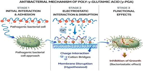 Schematic illustrates the proposed three-stage antibacterial action of γ-PGA. Stage 1: Initial interaction and adhesion-the anionic γ-PGA polymer interacts with the approaching pathogenic bacterial cell surface. Stage 2: Electrostatic interaction and membrane disruption-γ-PGA forms electrostatic interactions, including cation-bridging (e.g., Ca2+), leading to destabilization of the bacterial membrane. Stage 3: Functional effects-membrane perturbation and physicochemical stress result in inhibition of bacterial growth, suggesting a primarily bacteriostatic effect.