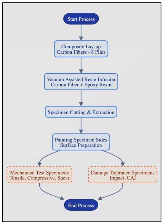 To form composite plates, DowAksa 24K-A42-1600 Tex carbon fibers (Yalova, Turkey) were used as reinforcement, and epoxy resin coded FBRMAKRES-11564 (Yalova, Turkey) with a hardener coded FBRMAKHARD-13487 (Yalova, Turkey) were also used in a special vacuum table with temperature and time adjustment (for 30 min at 50 °C and 8 h at 80 °C) in the vacuum-assisted resin infusion method in the Dokuz Eylul University Mechanical Engineering Composite Materials Lab. The physical and mechanical properties of elements of composite plates given in the manufacturer’s catalog [26] are shown in Table 1. The testing processes applied in this study are summarized in the diagram in Figure 1.