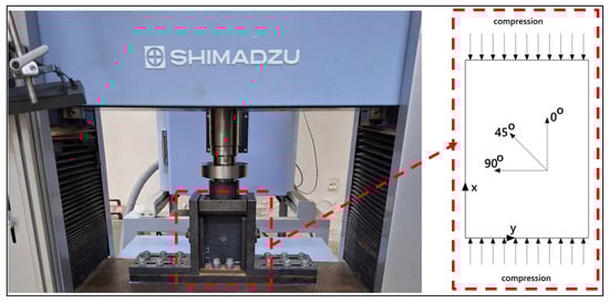 In order to determine the effect of damage occurring after low-velocity impact on the strength of the material, the change in the material’s compressive strength was measured using the CAI test apparatus on a Shimadzu AG-X test device (Kyoto, Japan). The apparatus on the test plates was designed to ensure equal distribution of the load and to prevent buckling due to the applied loads and fixed the samples at their four corners (bottom, top, and sides) and the specimen view, as shown in Figure 4. The compression speed of the device was selected as 1 mm/min. The test device can measure and record the applied force, advancement amount, and strain data. Six different laminated plates [0°/90°/45°/−45°]s, [90°/45°/−45°/0°]s, [0°/90°/0°/90°]s, [90°/0°/90°/0°]s, [−45°/45°/−45°/45°]s, and [45°/−45°/45°/−45°]s were tested according to the ASTM.D7137/ D7137M−23 standard [12].