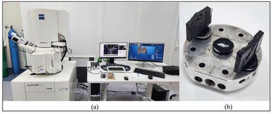 (a) The Zeiss GeminiSEM 560 instrument (b) Apparatus used for SEM analysis.