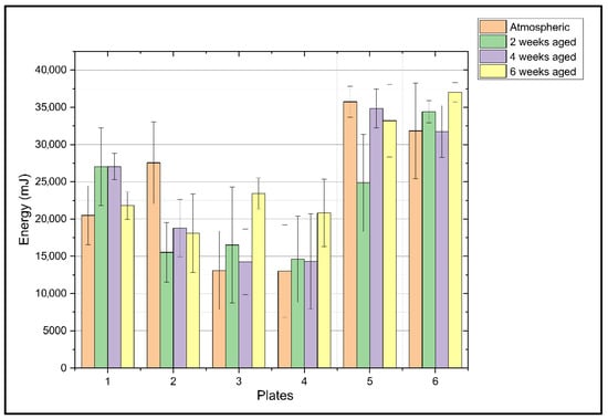 Figure 6 presents a comparison of the energy dissipated by the manufactured plates under atmospheric and aged conditions, clearly showing significant differences depending on the layering type.
