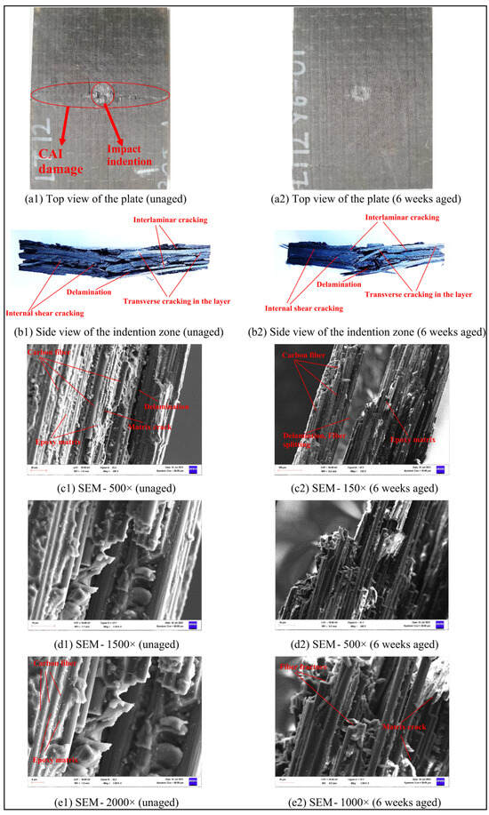 Interlaminar cracking, delamination, internal shear cracking, and transverse cracking in the layer were observed in both unaged and six-week-aged specimens in Figure 7(b1,b2).