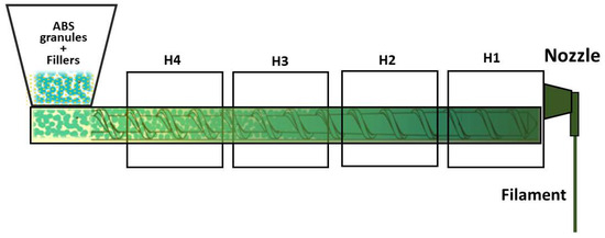 Schematic overview of the extrusion setup used for composite filament fabrication.
