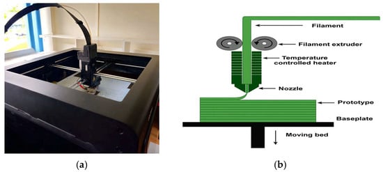 (a) Zortrax M300 3D printer used to fabricate ABS and composite samples. (b) Schematic representation of the FDM printing process.