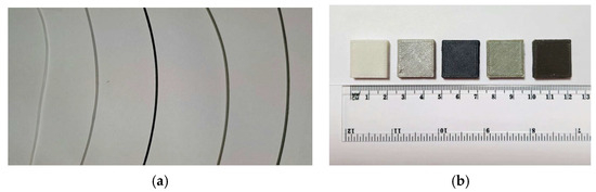(a) Extruded ABS-based composite filaments; (b) 3D-printed samples (20 mm × 20 mm × 5 mm) of each material formulation. Materials are arranged from left to right as follows: ABS, ABS–5BN, ABS–30W, ABS–10Gd2O3, and ABS–30Bi2O3.